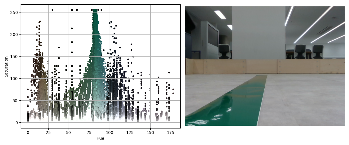 In the plot, you should be able to identify a cluster of data points that are the same colour as the line on the floor. From the plot, make a note of the range of Hue and Saturation values that these dots reside within.