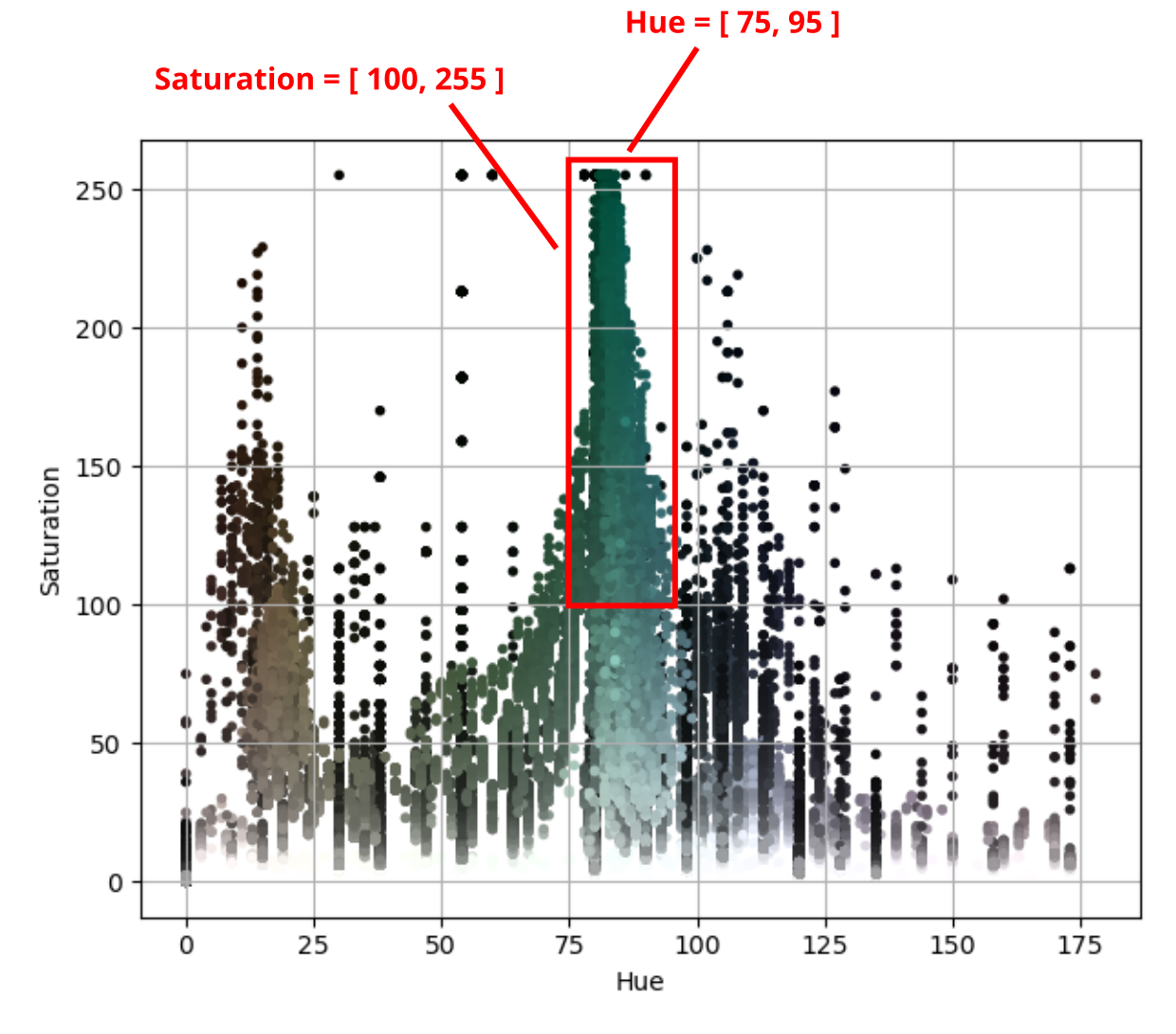 The scatter plot shows all the different colours that are present in the raw camera image. These are plotted in terms of the Hue and Saturation values of each pixel in the image.