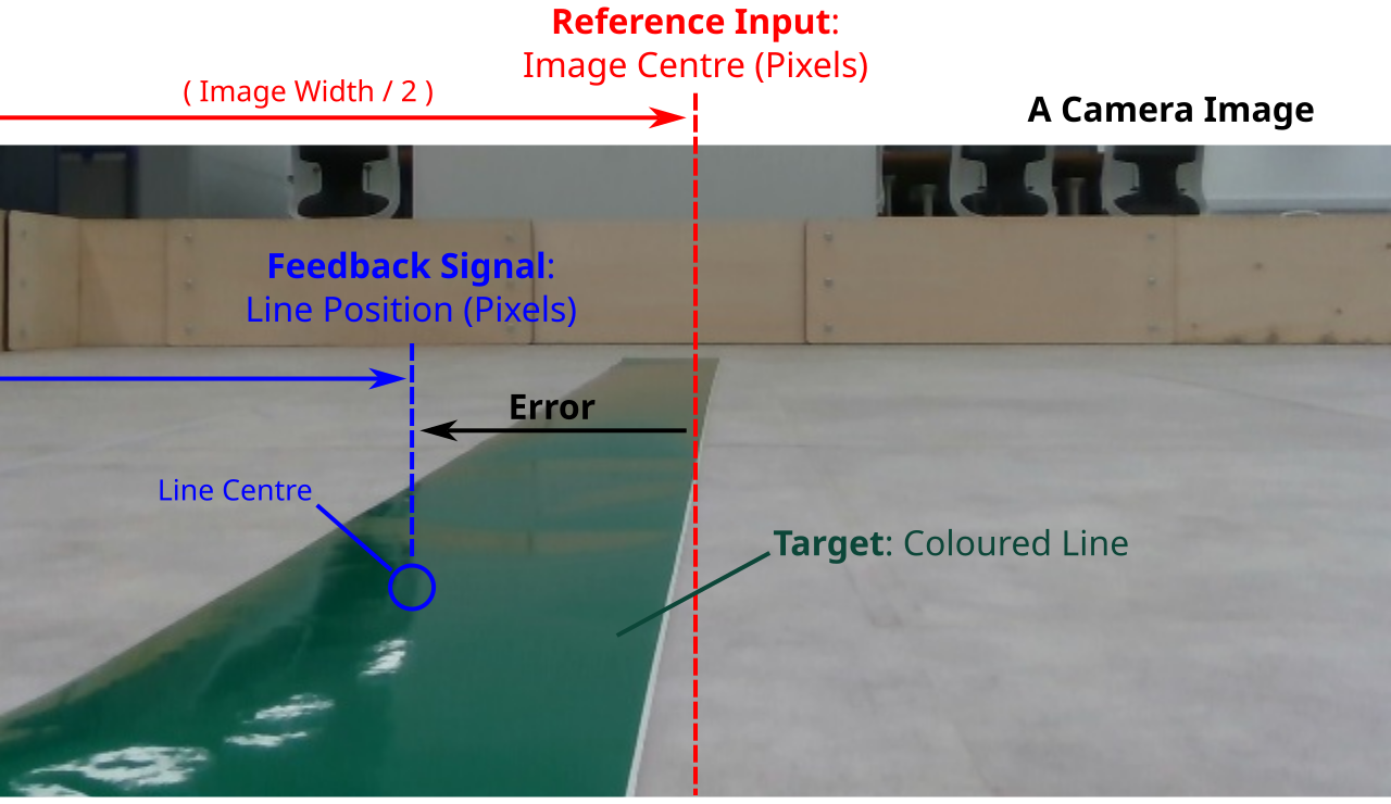 If we want our robot to successfully follow a coloured line on the floor, we will need it to keep that line in the centre of its view point at all times by minimising the error between where the line currently is (the feedback signal) and where it should be (the reference input, i.e. the centre of its view point). In this case then, the PID algorithm provides us with an angular velocity command (the controlled output) to achieve this.