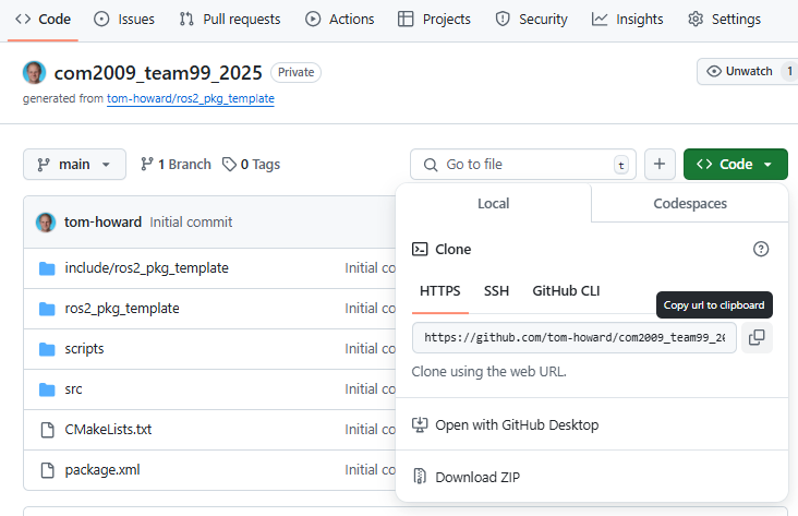 Codebutton and then, from the dropdown menu, click the button to copy the remote HTTPS URL of your repo.