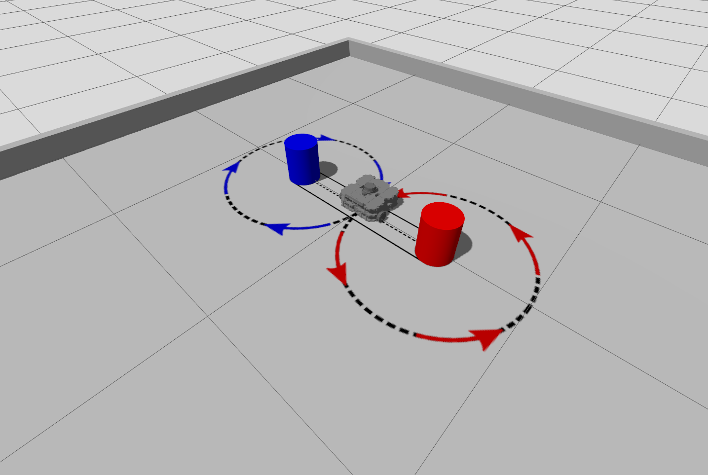 As shown above, for the assessment there will be cylindrical beacons placed at the centre of each of the figure-of-eight loops which the robot will need to move around as it completes the task. We have therefore also created a simulation environment that is representative of the real world environment. This is available in the tuos_task_sims package, which is part of the tuos_ros Course Repo. The instructions for downloading and installing this within your own local ROS installation are available here.