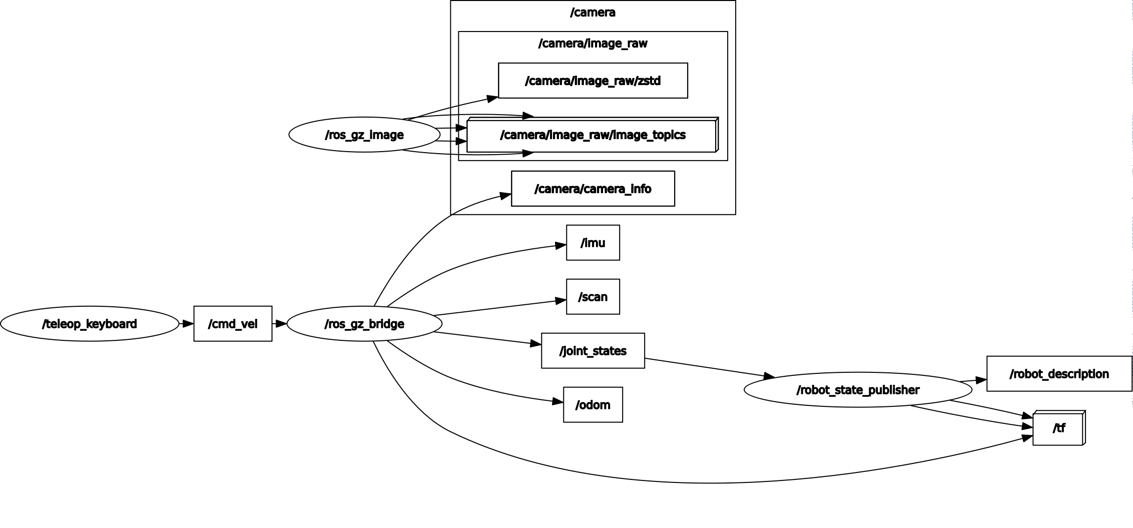 /teleop_keyboardnode is communicating with another node called/ros_gz_bridge. The direction of the arrow tells us that/teleop_keyboardis a Publisher and/turtlebot3_diff_driveis a Subscriber. The two nodes communicate via a ROS Topic called/cmd_vel.