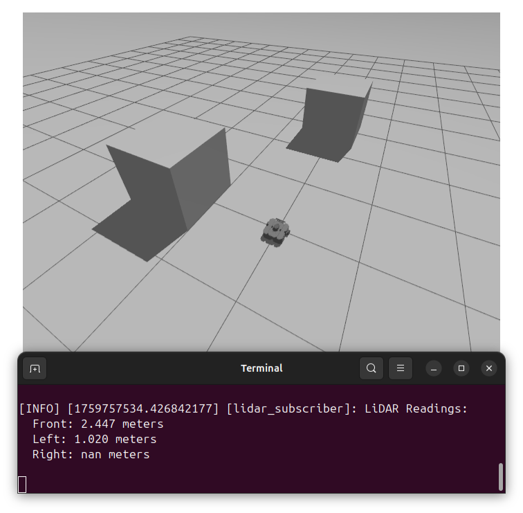 lidar_subscriber.pynode reportsnan metersnow. That's because there's nothing in the environment for the LiDAR sensor to detect, so all readings are out of range and hence our analysis of the 40° arc of LiDAR readings at the front of the robot has filtered out everything and therefore returnednan(not a number). -
