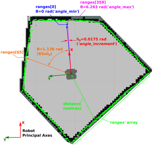 The ranges array contains 360 values in total, i.e. a distance measurement at every 1° (an angle_increment of 0.0175 radians) around the robot. The first value in the ranges array (ranges[0]) is the distance to the nearest object directly in front of the robot (i.e. at θ = 0 radians, or angle_min). The last value in the ranges array (ranges[359]) is the distance to the nearest object at 359° (i.e. θ = 6.283 radians, or angle_max) from the front of the robot, i.e.: 1 degree to the right of the X-axis. ranges[65], for example, would represent the distance to the closest object at an angle of 65° (1.138 radians) from the front of the robot (anti-clockwise), as shown in the figure.