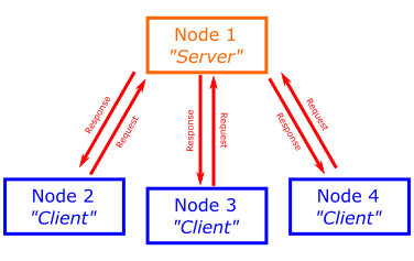 This is a bit like a transaction: one node requests something, and another node fulfils that request and responds. This is good for quick, short duration tasks, e.g.: