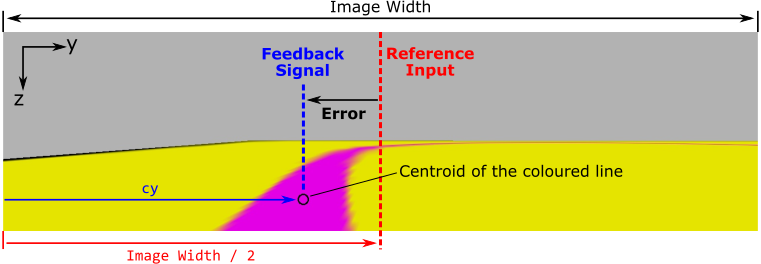 A Feedback Signal informs us of what the current state of the system actually is. In our case, this feedback signal would be the real-time location of the coloured line in the live camera images, i.e. its cy centroid (obtained using processing methods such as those covered in Exercise 3 above).