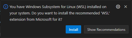 The first time you launch VS Code (as above) you should be presented with a pop-up in the bottom-right of the screen, asking if you would like to "install the recommended 'WSL' extension from Microsoft..."